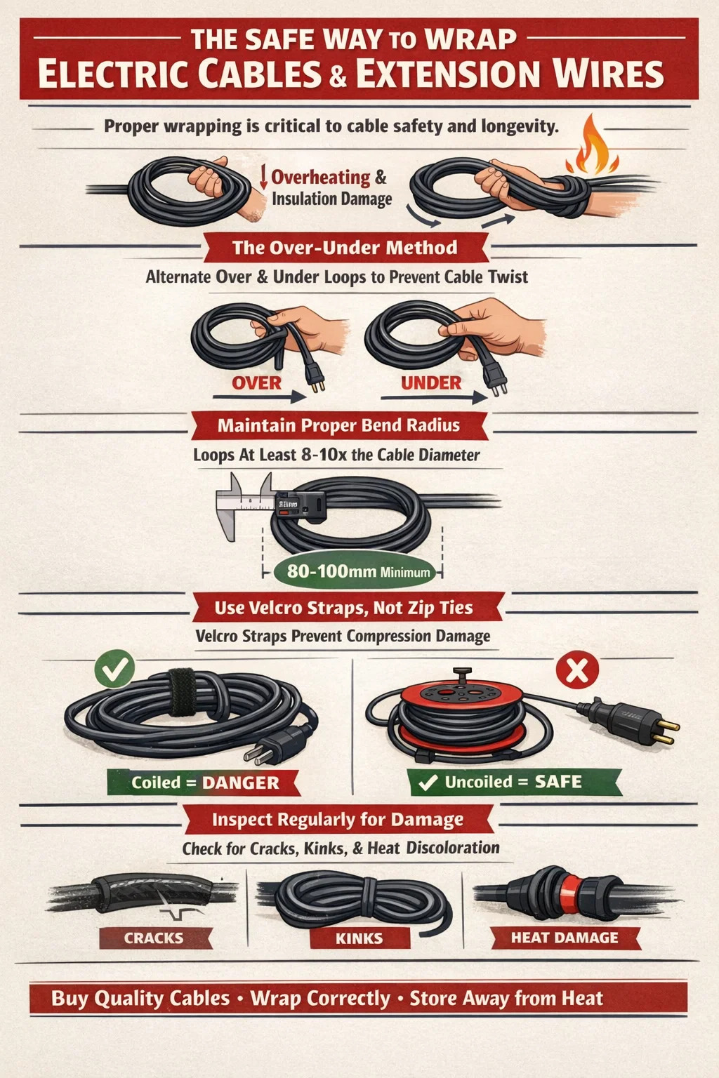 Свертывание электрических кабелей и удлинительных проводов по своей сути не приводит к повреждению или угрозе безопасности. Однако то, как вы их обертываете, имеет огромное значение. Плотная намотка, изгиб под острыми углами или связывание кабелей в жгуты под нагрузкой могут привести к выделению тепла, ухудшению изоляции и сокращению срока службы провода. Основной причиной большинства неисправностей кабеля является не сама намотка, а неправильная техника намотки в сочетании с некачественной конструкцией кабеля.