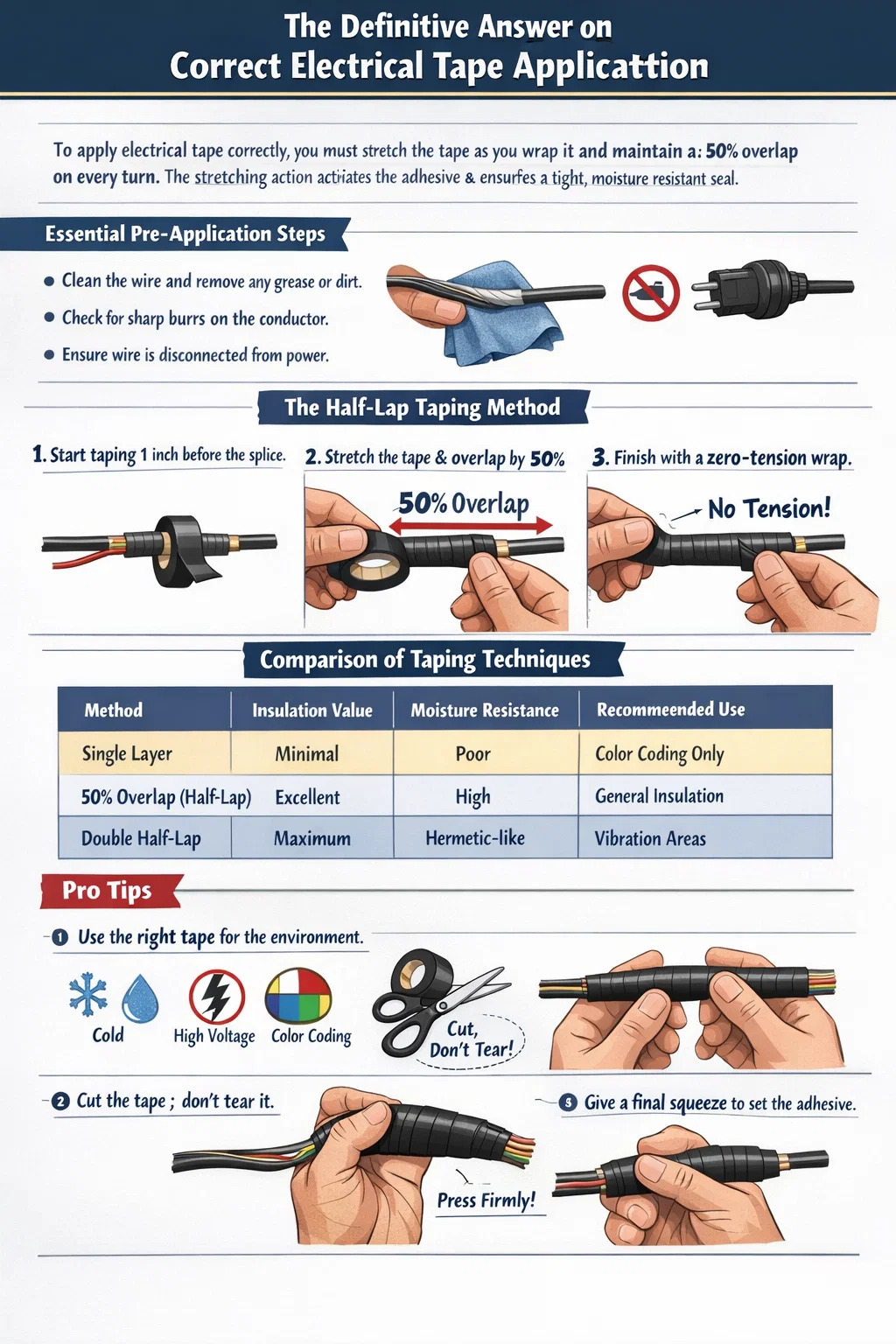 Чтобы правильно наложить изоленту, необходимо растягивайте ленту, когда обматываете ее и поддерживать перекрытие 50% на каждом шагу. Растягивающее действие активирует клей и обеспечивает плотное, влагостойкое прилегание, а перекрытие в половину круга обеспечивает двойной слой изоляции, имитирующий защитную оболочку, созданную профессионалом. экструдер для проволоки и кабеля . Всегда завершайте ленту обмоткой с нулевым натяжением на последнем витке, чтобы лента не отслаивалась и не отслаивалась с течением времени.
