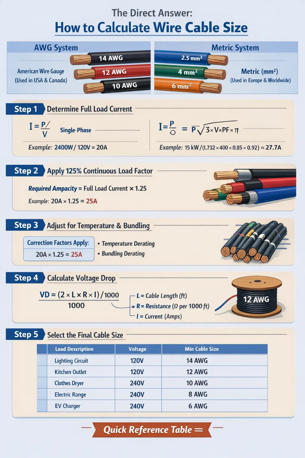 Чтобы рассчитать размер кабеля, вам необходимо определить максимальный ток (силовую нагрузку), который должен выдерживать кабель, а затем применить пределы падения напряжения и коэффициенты безопасности, чтобы выбрать правильное поперечное сечение проводника. Наиболее широко используемая формула основана на законе Ома в сочетании со стандартами Национального электротехнического кодекса (NEC) или IEC. Для большинства систем переменного тока основное правило таково: выбирайте проводник, токовая нагрузка которого превышает 125 % постоянного тока нагрузки. Для цепей постоянного тока или более длинных кабелей приоритет имеет расчет падения напряжения.