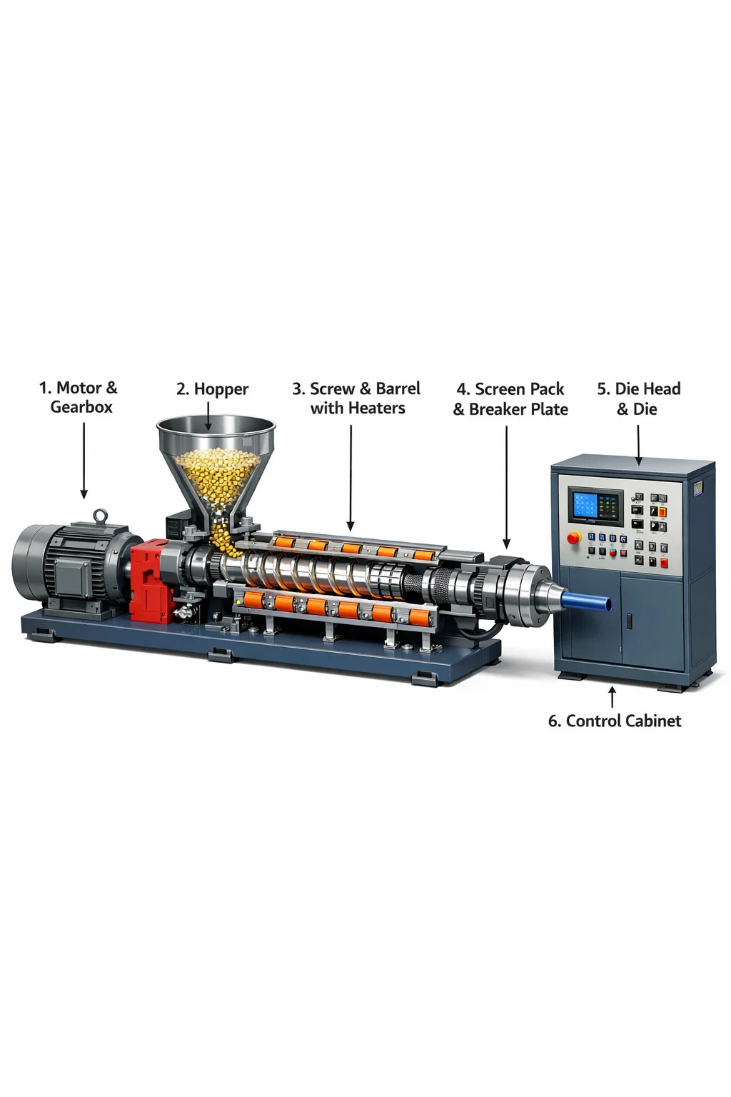 Хотя экструдер выглядит как громоздкий, тяжелый металлический шкаф, его внутренняя структура очень сложна. Мы можем представить его как «перегретый смесительный насос», состоящий в основном из следующих основных частей: