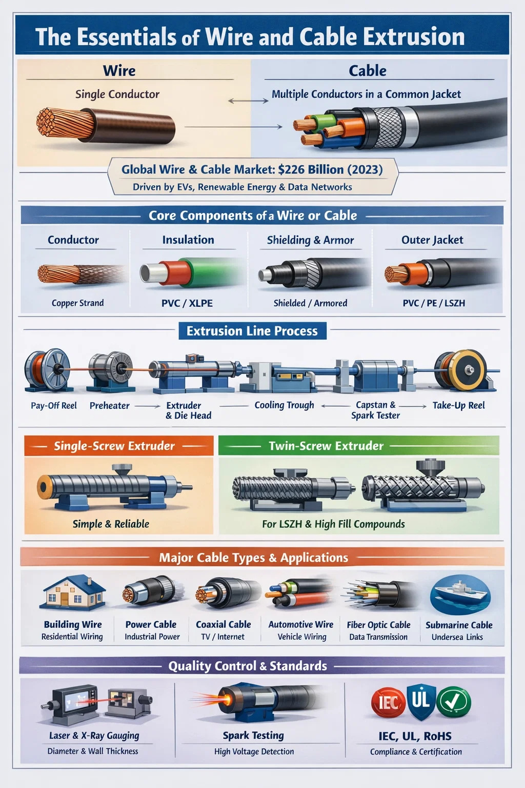 На практике для заземления можно использовать голый медный провод, а в жилом доме подавать электроэнергию можно по многожильному кабелю с ПВХ-изоляцией. Мировой рынок проводов и кабелей оценивался примерно в 226 миллиардов долларов США в 2023 году и, по прогнозам, будет стабильно расти, обусловленное урбанизацией, расширением инфраструктуры электромобилей и проектами по возобновляемым источникам энергии. Понимание разницы между проволокой и кабелем является основой для выбора правильных материалов, производственного процесса и оборудования, включая правильный экструдер для проволоки и кабеля.