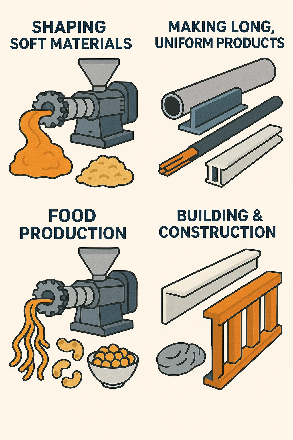 Ан экструзионная машина это как мощный «пресс для пластилина» для фабрик. Он пропускает мягкие материалы через фасонные отверстия для создания длинных, непрерывных изделий с фиксированным поперечным сечением. Вот для чего он используется в повседневной жизни:
