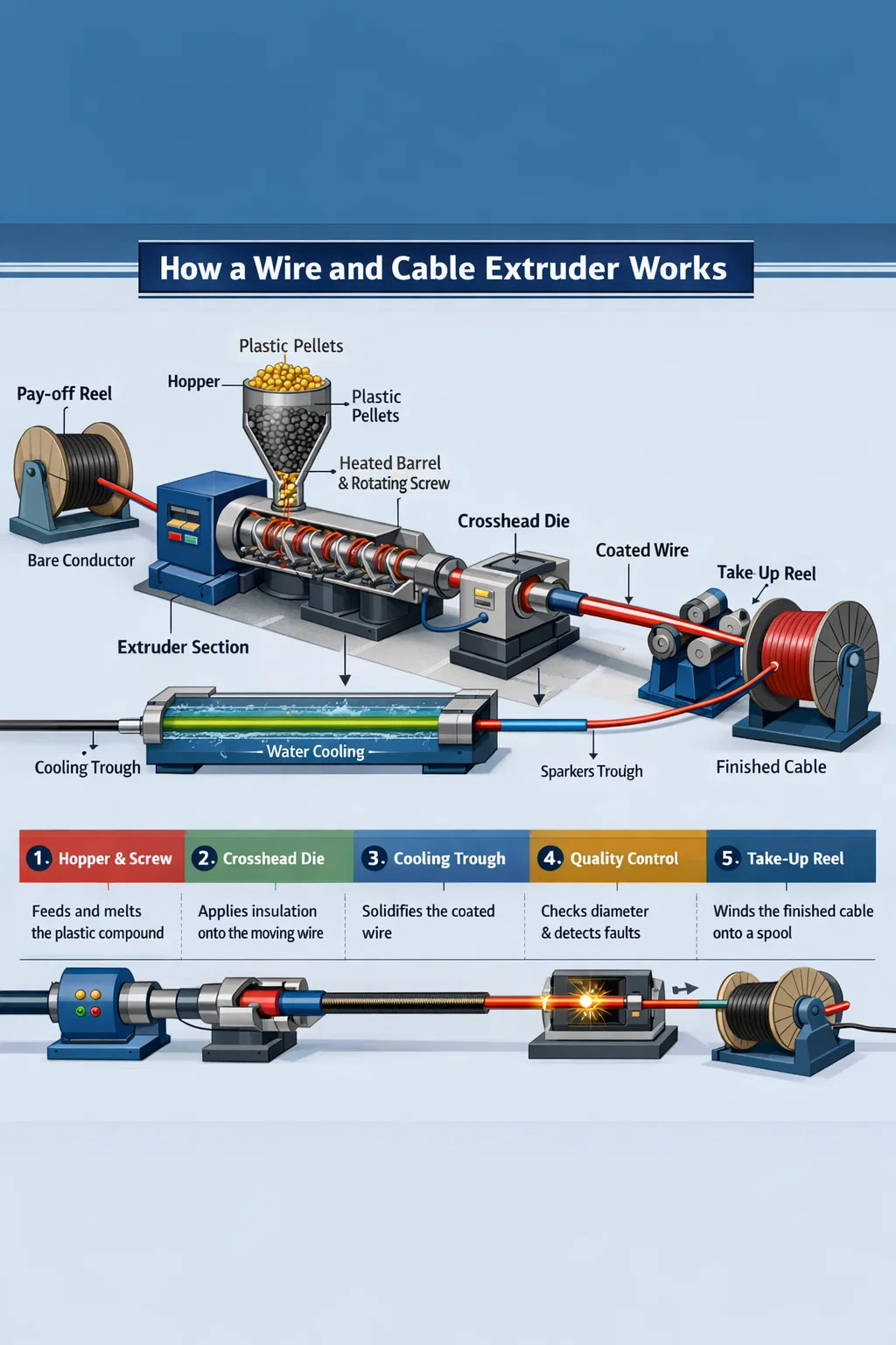 Экструдер для проволоки и кабеля состоит из нескольких интегрированных подсистем. Каждый из них играет особую роль в преобразовании необработанного соединения в стабильный по размерам, электрически изолированный проводник.